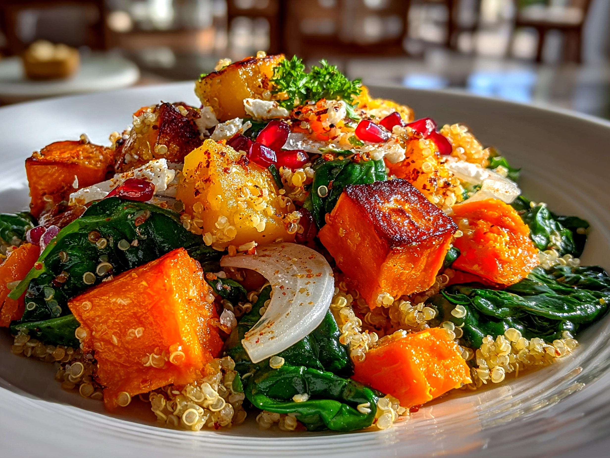 Presentation-wise, a shallow wooden bowl with a sprinkle of fresh parsley on top brings out this salad’s rustic appeal. Guests often comment on its inviting colors—the deep orange of sweet potatoes against the bright apple dice and green parsley makes it an autumn quinoa salad that looks as good as it tastes.