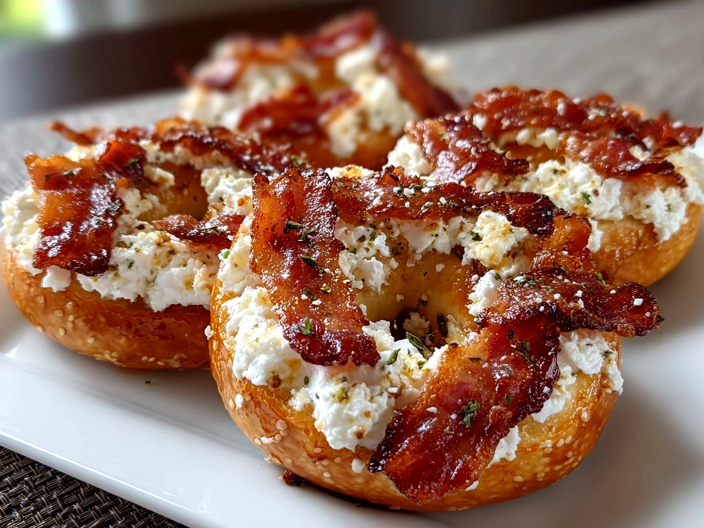 These Bacon Cream Cheese Bagels feature a crispy bacon and creamy cheese filling layered inside a toasted bagel, perfect for a savory breakfast or snack.