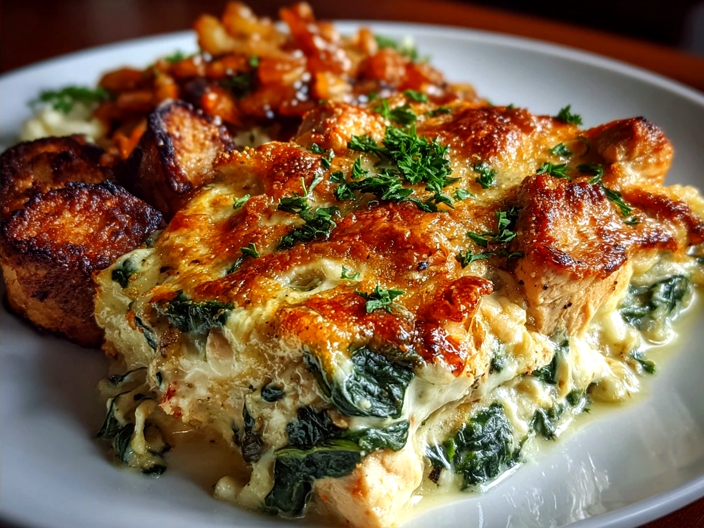 A comforting and nutritious casserole blending tender chicken, fresh spinach, and creamy cheese, perfect for an easy weeknight dinner.