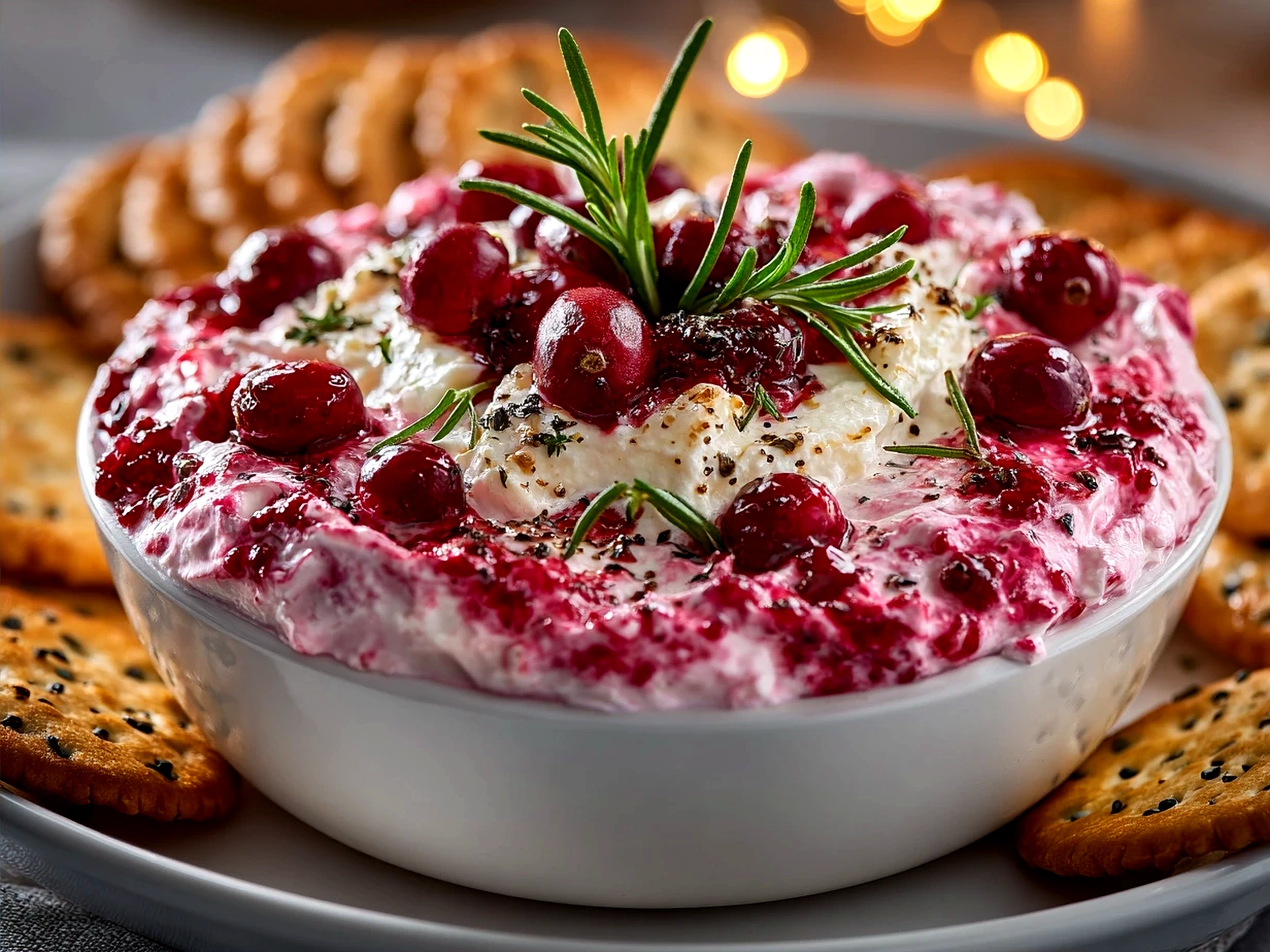 This tangy and creamy cranberry whipped feta dip is a perfect festive appetizer served with crispy crackers, combining smooth feta cheese with bursts of fresh cranberry flavor.