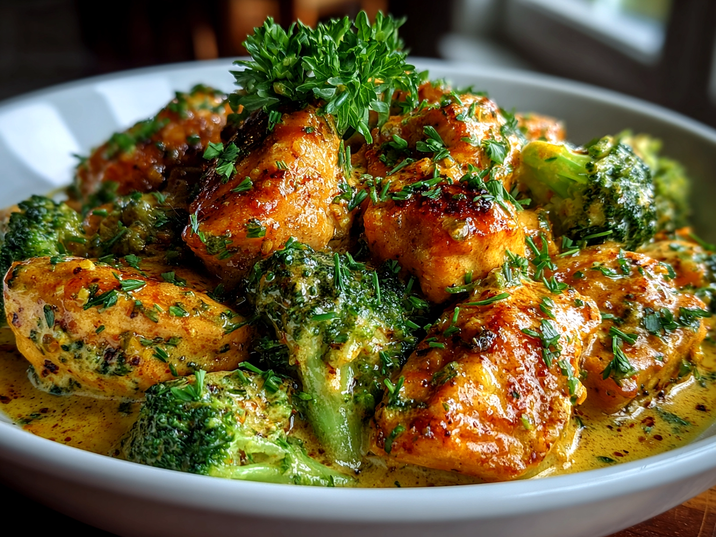 - Stir gently before serving to combine the chicken, broccoli, and cheesy sauce. Serve hot.
