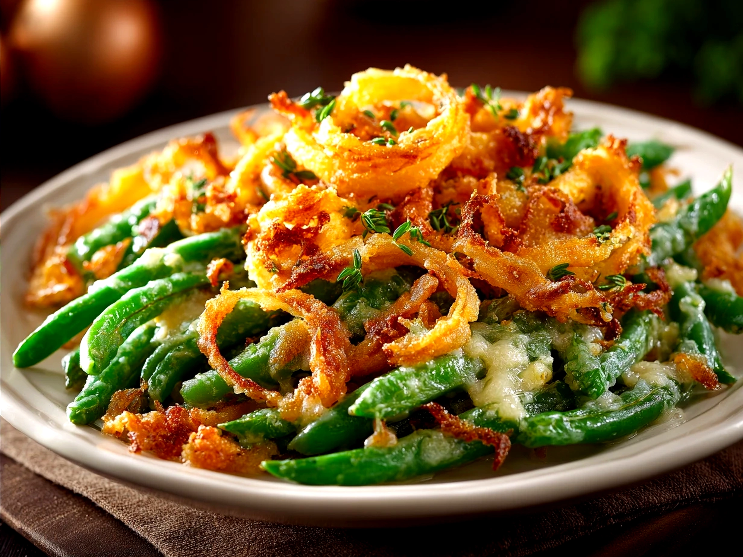 A classic American side dish featuring tender green beans baked in a creamy mushroom sauce topped with crispy fried onions, perfect for holiday dinners or everyday meals.