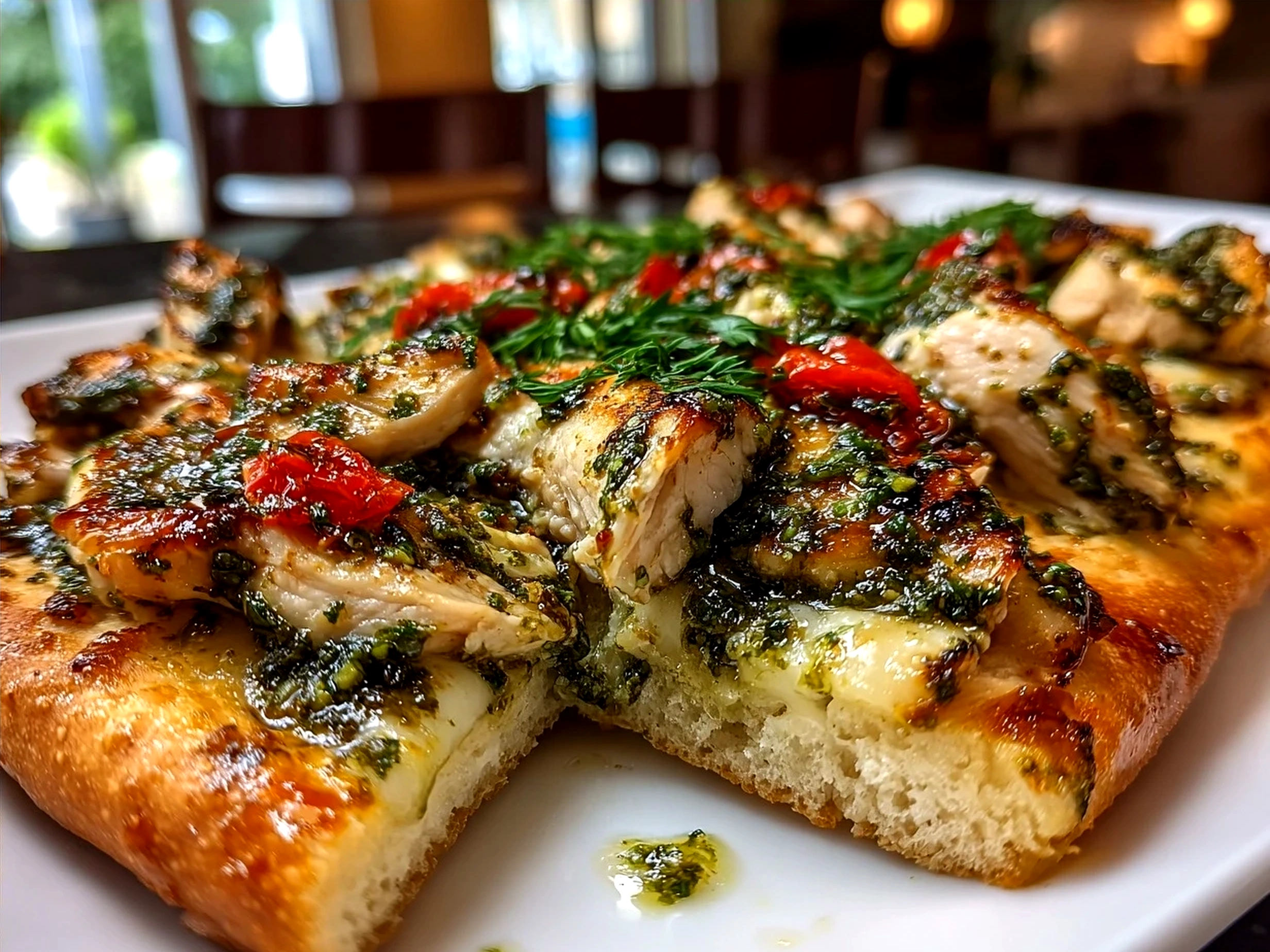 8. Remove carefully from the oven and let your Pesto Chicken Flatbread rest for a few minutes before slicing. This pause lets flavors settle and improves texture.