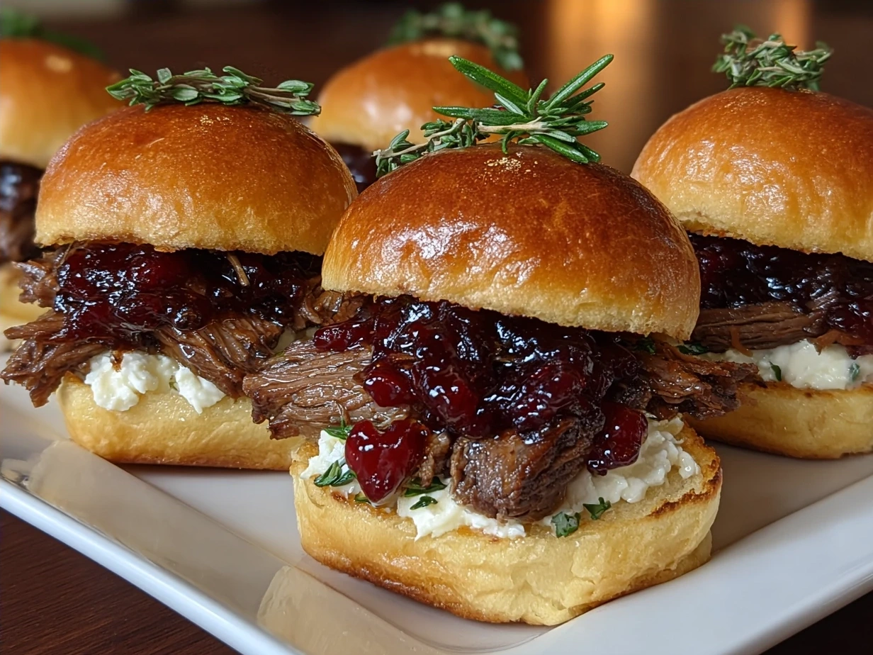 Tender slow-cooked short rib sliders topped with a tangy balsamic cranberry sauce, perfect for an elegant appetizer or a savory snack.