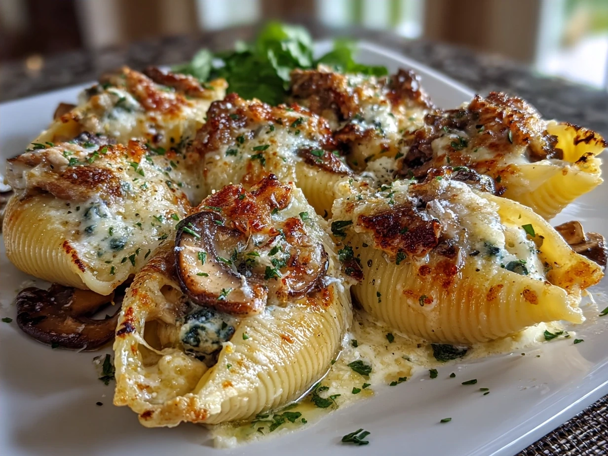 Delicious jumbo pasta shells stuffed with a creamy mushroom filling enhanced by white wine, baked to perfection for a comforting Italian-inspired meal.